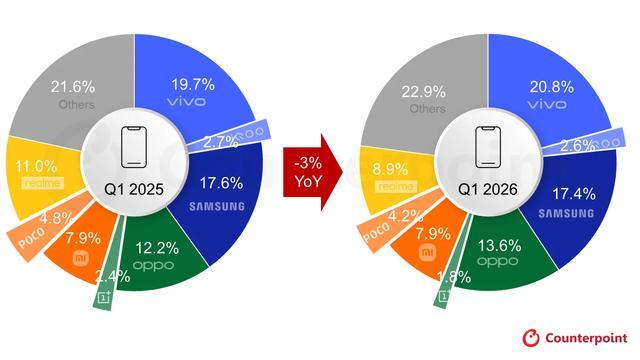 今天分享的是2026年Q1印度智能手机出货量榜单,这次的数据来源是市调机构Counterpoint,在存储上涨等因素的加持下,本季度出货量同比下跌3%。根据市调机构的数据,该季度有超过80款手机平均涨价15%。这应该就是出货量下跌的主要原因。本季度榜单排名几乎没有变化,小米排名第四,OPPO排名第三,vivo以23.4%的份额再次无人撼动。